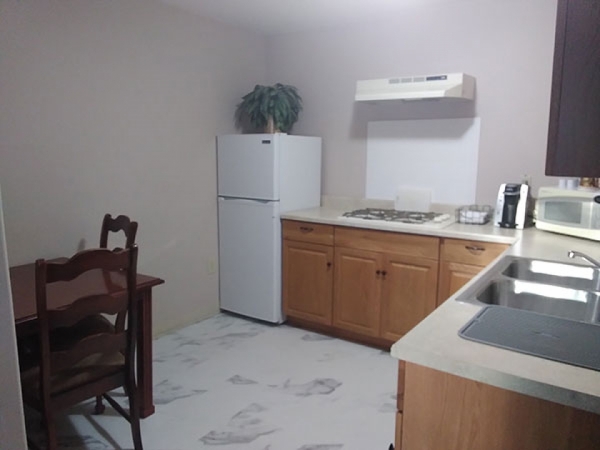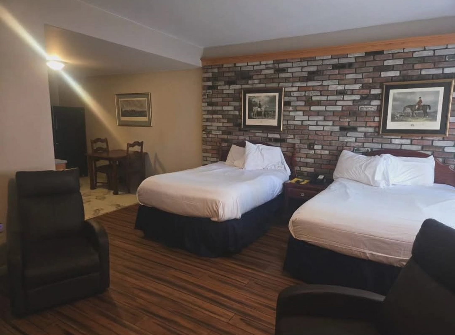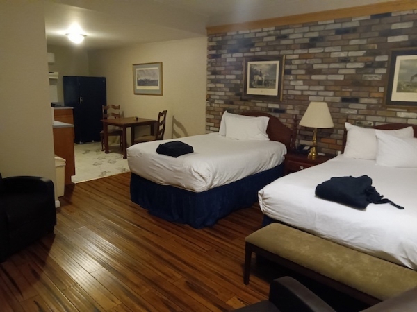 The Deluxe Double Rooms are known for their large size and unconfined layout. It includes a fully equipped kitchen area offers the ability to enjoy your complimentary coffee and tea service or a full meal. You will find a standard size refrigerator, cabinets and counter space, dishes utensils, microwave, and kitchen table and chairs. The bathroom features a full size bathtub and shower. Relax in the reclining chairs or outdoor rocking chairs. All rooms are nonsmoking.