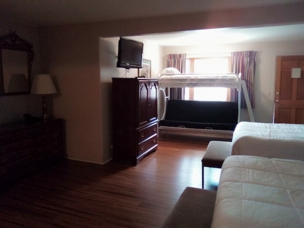 This Room has all the features of the Deluxe Double; but is a third larger in size and has a more spacious kitchen.  There is a Futon that acts as a couch and a bed with a bunk bed on top to accommodate extra guests. It is a second floor room that opens up to a balcony with rocking chairs that overlook the courtyard. This is a nonsmoking room.